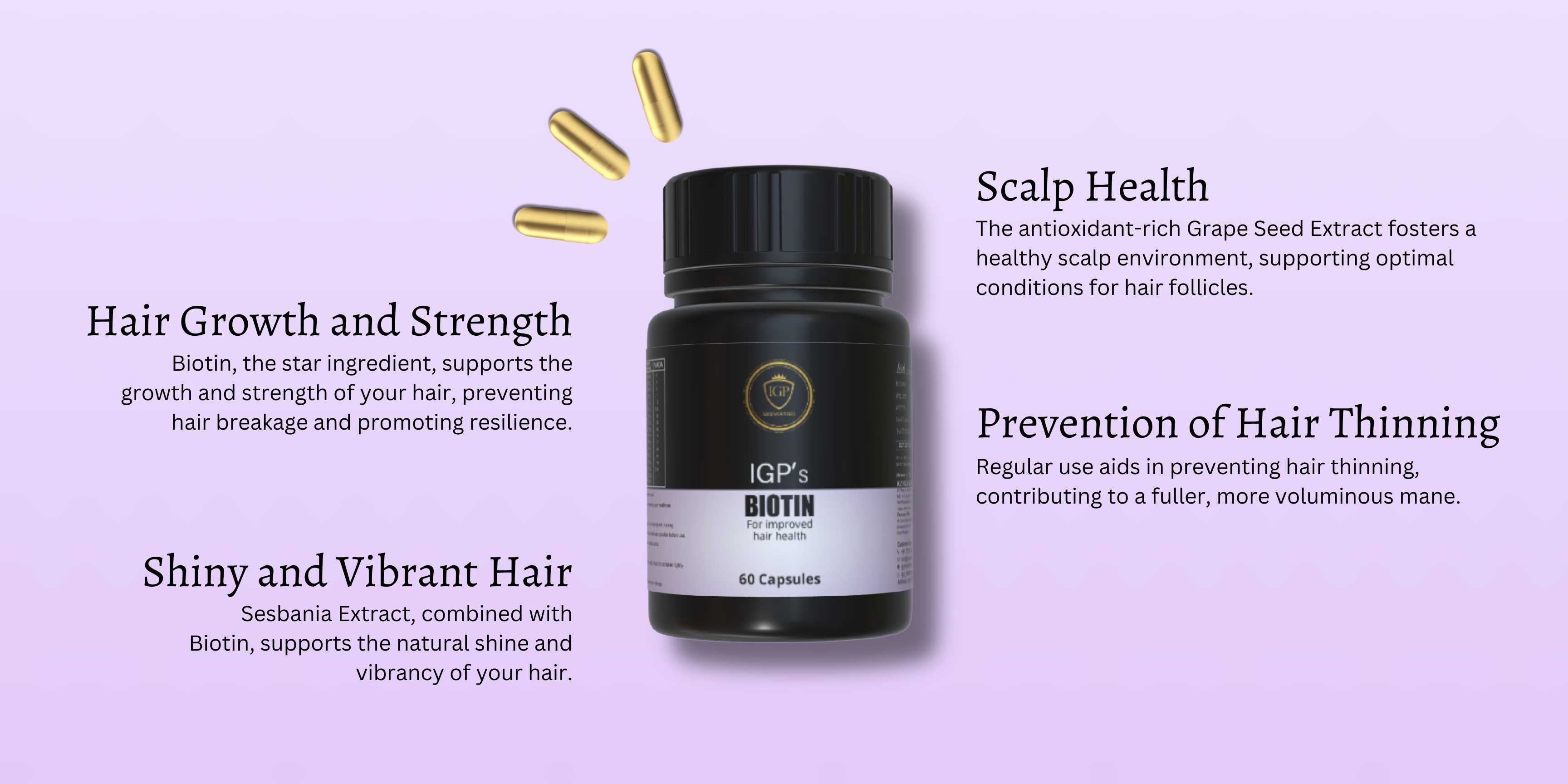 IGP's BIOTIN Capsules contain a combination of Vitamin C, E, A, B6, B12, and B9 to provide a comprehensive range of nutrients that support overall hair health. These vitamins contribute to collagen production, antioxidant protection, and maintenance of healthy hair follicles.