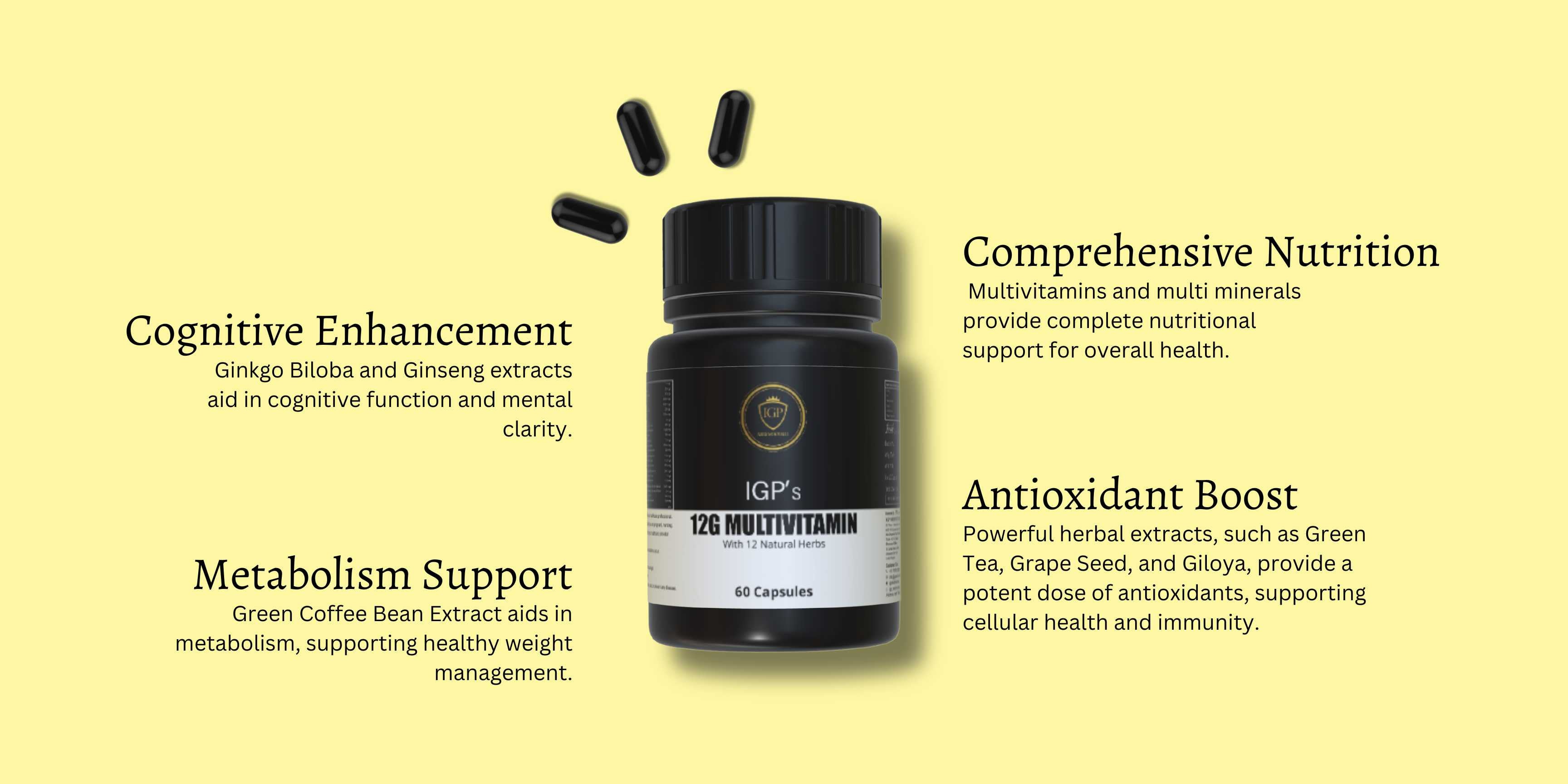 IGP's 12G Multivitamin Capsules are suitable for adults of all genders who seek comprehensive nutritional support. Whether you are a busy professional, a fitness enthusiast, a senior looking to maintain vitality, or someone in need of overall wellness support, these capsules are crafted for you.